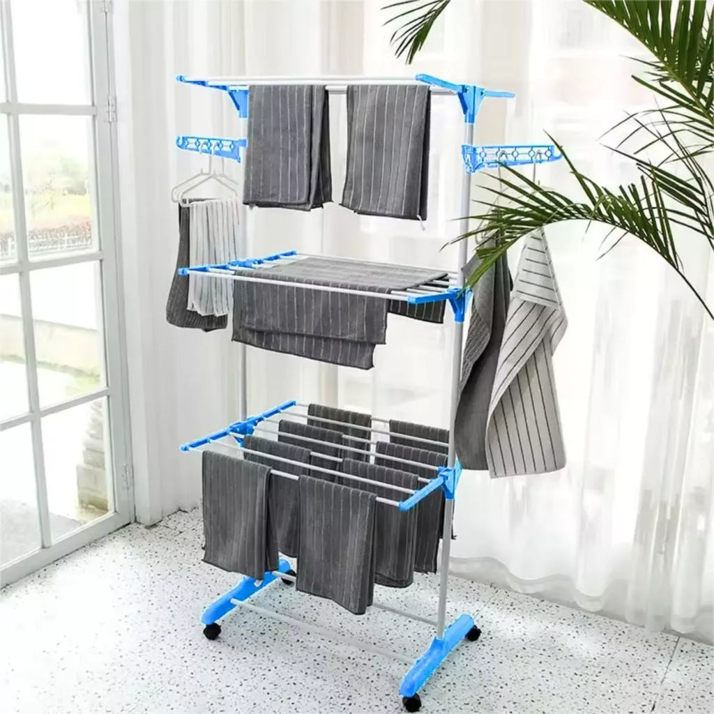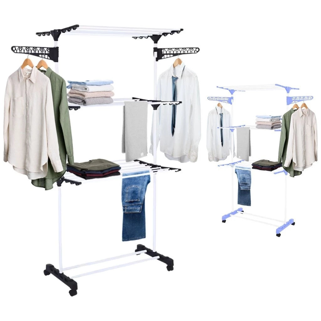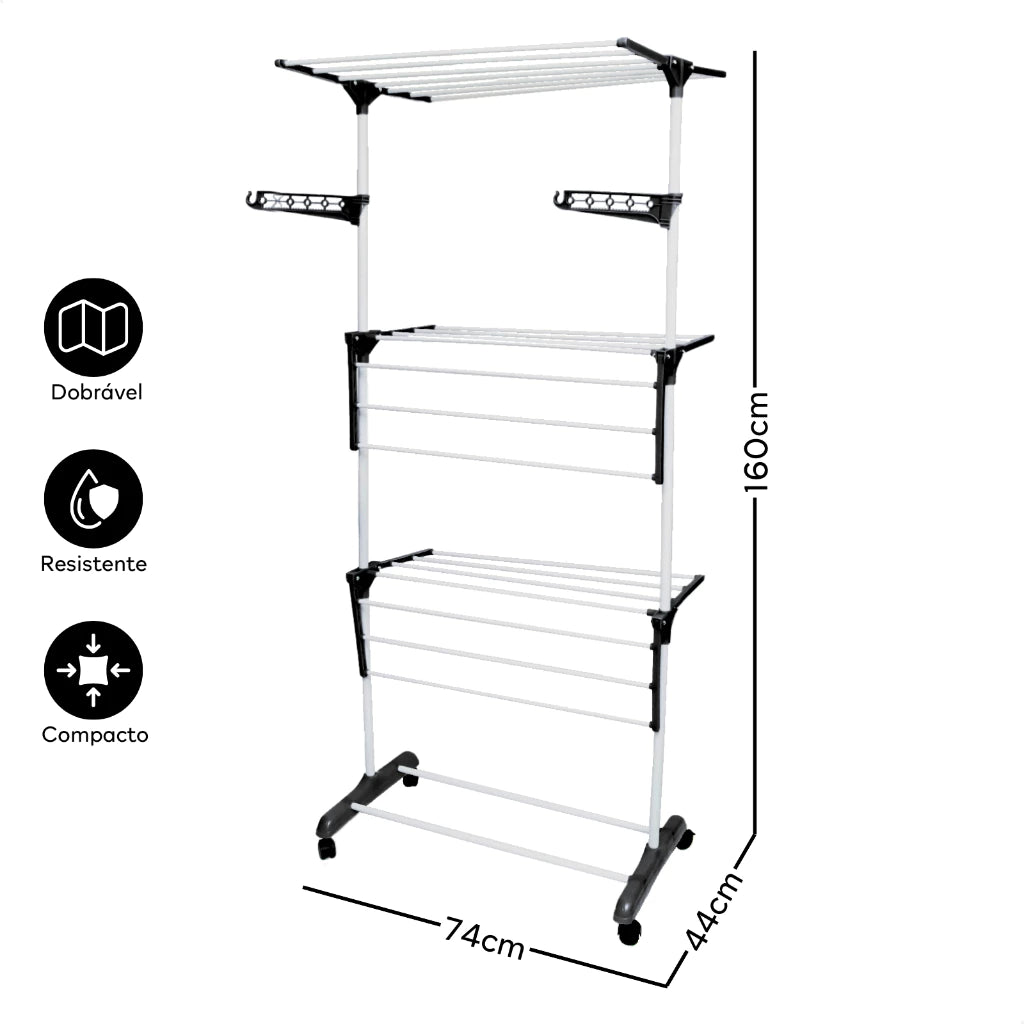 Com 3 andares de prateleiras reguláveis, este varal compacta o máximo de roupas ocupando o mínimo de espaço. Ideal para quem vive em ambientes pequenos ou para quem tem uma rotina cheia e precisa de algo rápido e eficiente!